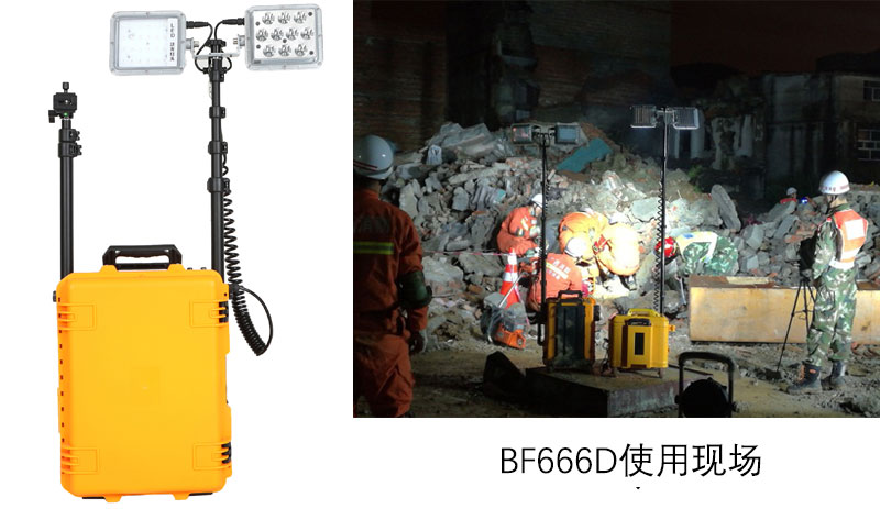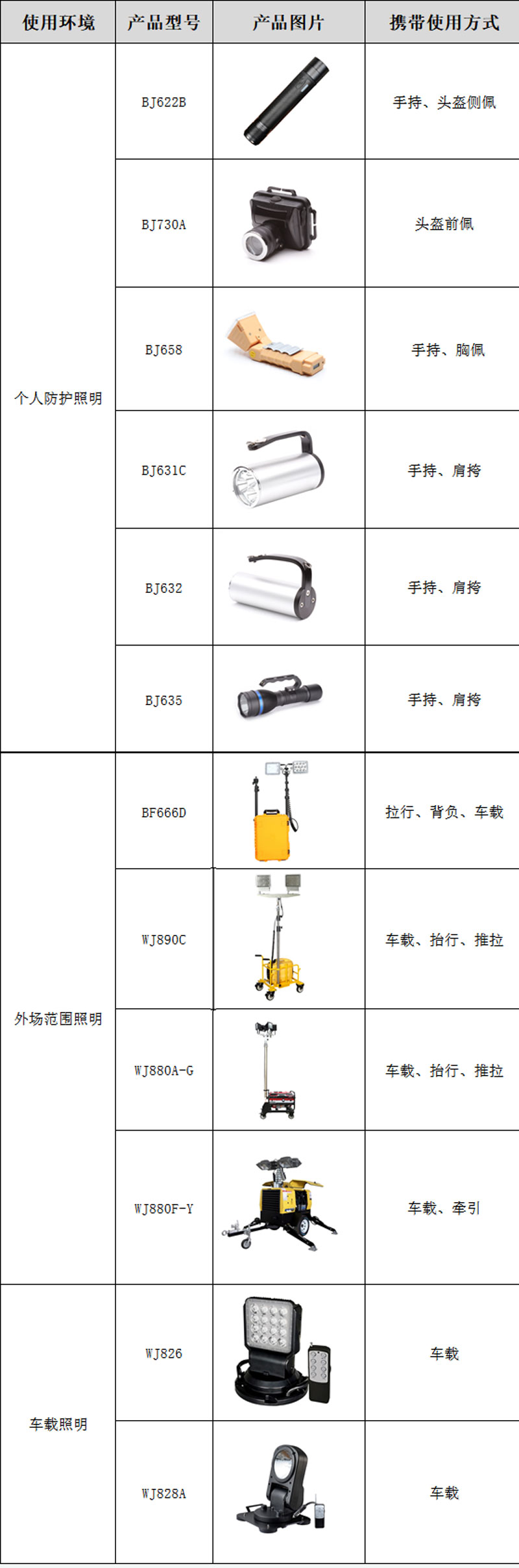BF666D(FW6108)/WJ890C(SFW6121)/WJ880A-G(SFW6110B、GAD506A)等便捷式移动式多功能照明装置。拉杆箱式设计,可手提、拉动,即使在崎岖坎坷的地方也可以方便携带,整体灯具装卸快捷方便,可以快速展开中小范围的救援照明使用。