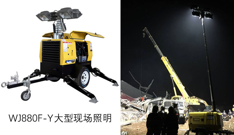 也可提供超大范围昼夜连续作业的大型照明灯塔,WJ880F-Y全方位移动照明灯塔, 采用4 个1000 W 高效节能灯头,照明亮度高,覆盖范围大.实现任意升降调节,最大升可起高度为10 米,灯光覆盖整个工作现场以确保各种救援场景的照明保障能力。