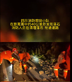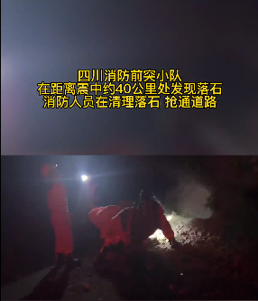 前往增援的阿坝森林消防支队马尔康大队率先抵达脚木足乡道路塌方处,他们边组织人员用铁锹清理落石塌方,边调集和重型车辆紧急抢通。