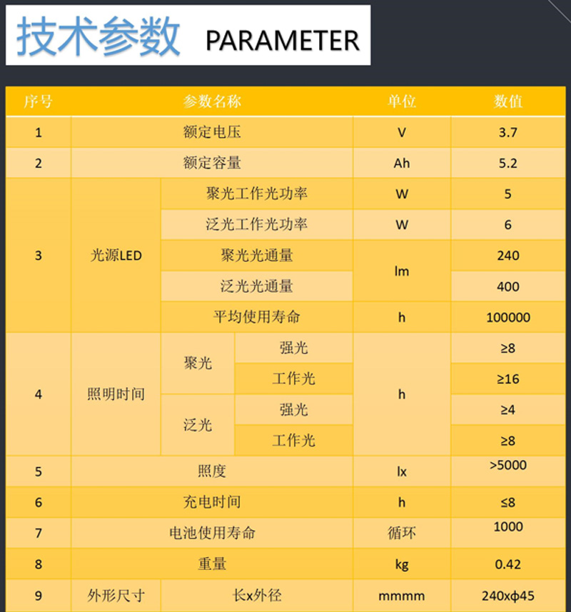 独特的设计,结构合理;拥有聚光、泛光、黄、红/蓝警示多种工作模式,能耗低、光效高、光线柔和、无眩光,用于帐篷日常照明使用,也可用于救援、搜索、现场作业照明及警示等多种场景。不会引起作业人员眼睛视觉疲劳,提高工作效率。
