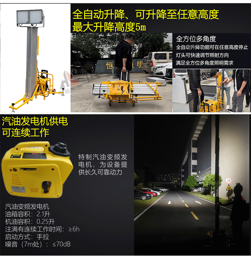 全自动升降功能可在任意高度停止,灯头可以快速调节照射方向,满足全方位多角度的照明需求。