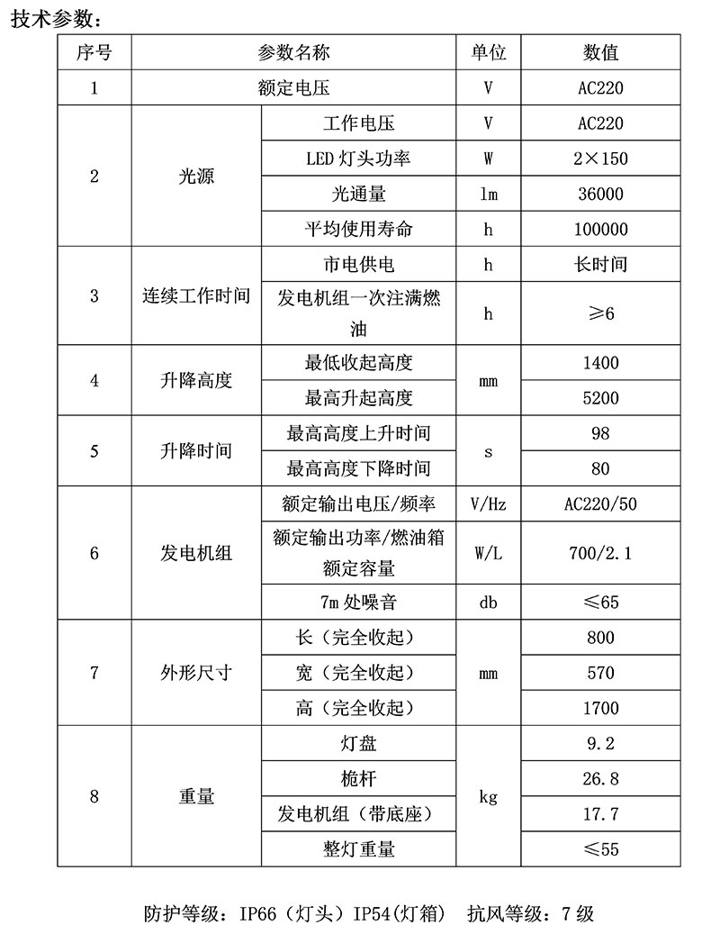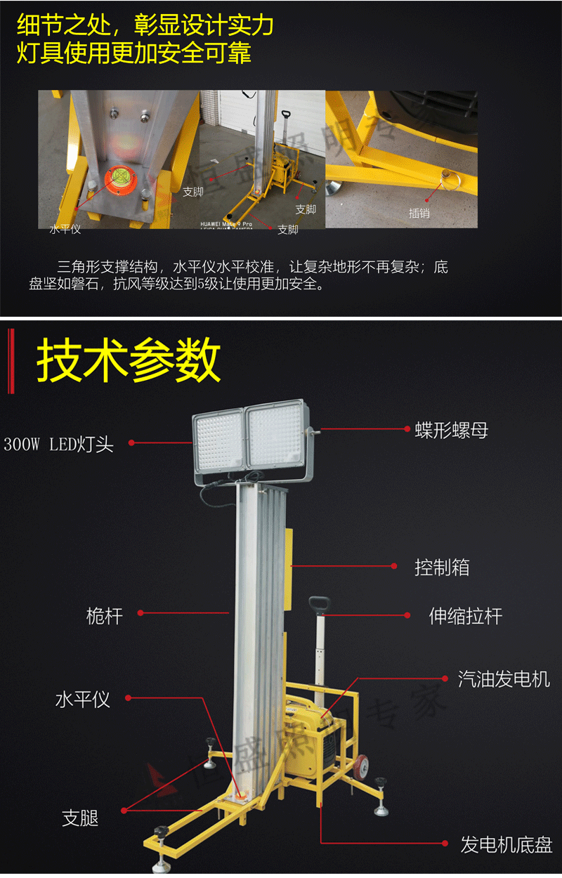 本产品的标准配置不能满足客户的工作需要,我司可在灯盘的灯头功率、泛光或聚光类型及发电机的配备上按客户要求做出调整,以满足客户的个性化需求。整体采用各种优质金属材料制作,结构紧凑、性能稳定,具备可调节支撑支脚、水平仪水平校准功能,三角形支撑结构可以适用于任何复杂地形,灯头防护等级为IP66,灯箱防护等级IP54,抗风等级达到7级,确保在各种恶劣环境和气候条件下正常工作。