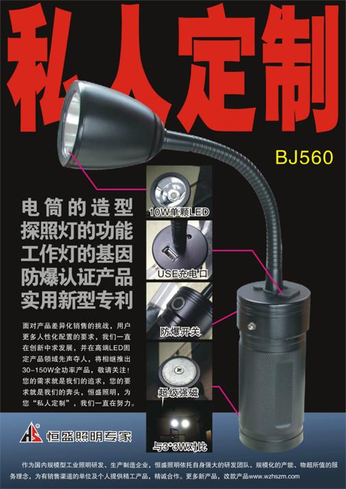 BJ560型多功能防爆工作灯实用性强,10W国际顶级品牌LED亮度高,深照配光聚光型强,照射距离远,强磁吸附式吸力强解放双手作业,蛇杆灯头结构可万向任意调节照明射方向,数码充电功能可为你随时随解决手机等电子产品应急充电功能,防爆结构设计并已通过国家级防爆认证,IP65的防护设计可在各种场合任意使用,经典!!