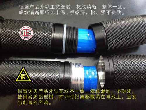 恒盛牌JW7623|JW7620佩戴式强光照明灯外观花纹细腻,有质感。打开灯具螺丝旋转顺畅丝滑。假冒伪劣JW7620佩戴式强光照明灯| JW7623多功能强光巡检工作灯则精糙,无质感可言,松开螺丝费劲,有铝沫脱落。
