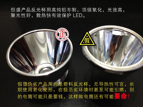恒盛牌JW7623|JW7620佩戴式强光照明灯反光杯是经过权威的配光研究所进行配光,并用铝车制确保配光的准确性及导热性,使LED寿命及反光杯日久弥新。而假冒恒盛牌JW7623|JW7620佩戴式强光照明灯则大胆的使用了塑料的电镀一层膜来坑骗用户,这种反光杯不仅没有进行专业的配光,短期内使用即可能泛黄,泛黑。致使的弱点是,如果长时间使用灯具产品有可能引起变形甚至燃烧。