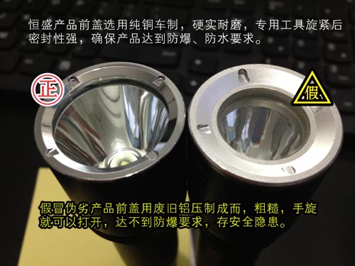 恒盛牌JW7623|JW7620佩戴式强光照明灯前盖用纯铜车制而成,使灯具在高空跌落也不会变形,可以正常使用,并需要有专用工具开盖或合盖,达到防爆要求。而假冒伪劣JW7620佩戴式强光照明灯| JW7623多功能强光巡检工作灯仅采用一个铝压制的前盖,手旋都可以打开,安全性能堪忧。
