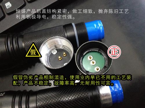 恒盛牌JW7623|JW7620佩戴式强光照明灯后盖安装紧凑,无松动,选用最先进的铜极导电。而假冒伪劣产品则是老旧工艺,做出来的灯具不耐震动,易松动,不牢靠。