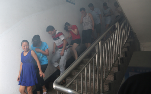 火场逃生演习要点:必需要用打湿的毛巾捂住口鼻,弯腰或者匍匐沿墙边走。这样就不会在浓烟吸入有害烟气中毒或被火灼伤,弯腰或者匍匐是因为有害毒气都是往上升,最下层是生命的真空区。沿墙边走就不会在火场迷失方向,有墙就有门,总会找到出口,安全退出。