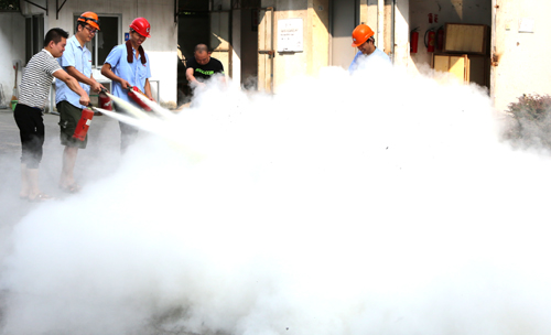 消防器材使用演练在公司大院举行,汹汹的火焰燃起,勇敢的消防队员冲进火场,拔出灭火器的保险,抽出插销,压下喷火嘴,干粉瞬间涌出,火苗就这样悄无生息的灭了。